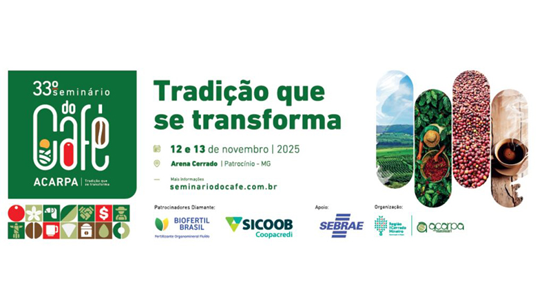 O município de Patrocínio (MG) – o maior em produção de café do Brasil –, recebe, nos dias 12 e 13 de novembro, o 33º Seminário do Café, um dos encontros mais tradicionais da cafeicultura da Região do Cerrado Mineiro. O evento acontecerá na Arena Cerrado, localizada no Parque de Exposições “Brumado dos Pavões”, reunindo produtores, técnicos, cooperativas, empresas, instituições de pesquisa e representantes do setor em dois dias de intensa programação.