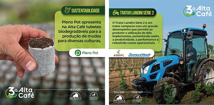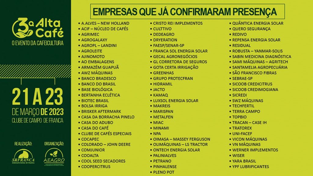 Ao todo, até o momento, 108 marcas já assinaram contrato para participar da ALTA CAFÉ. “Estamos preparando a maior vitrine do Agronegócio Café da nossa região. Em uma área maior, com mais expositores, com expositores expressivos da Cadeia Produtiva do Café, além de uma melhor infraestrutura. Tudo para garantir uma Alta Café ainda mais grandiosa e que ficará marcada na história!. A feira foi criada com o objetivo de promover a cafeicultura da nossa região. E pretendemos reunir nesta edição empresas de todos os setores, da semente à xícara”, ressaltou José Henrique Mendonça.