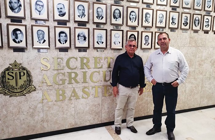 Francinaldo Alves (diretor da AEAGRO) e José Henrique Mendonça (presidente do Sindicato Rural de Franca e da AEAGRO) na sede da Secretaria de Agricultura e Abastecimento do Estado de São Paulo. (Créditos: Revista Attalea Agronegócios)
