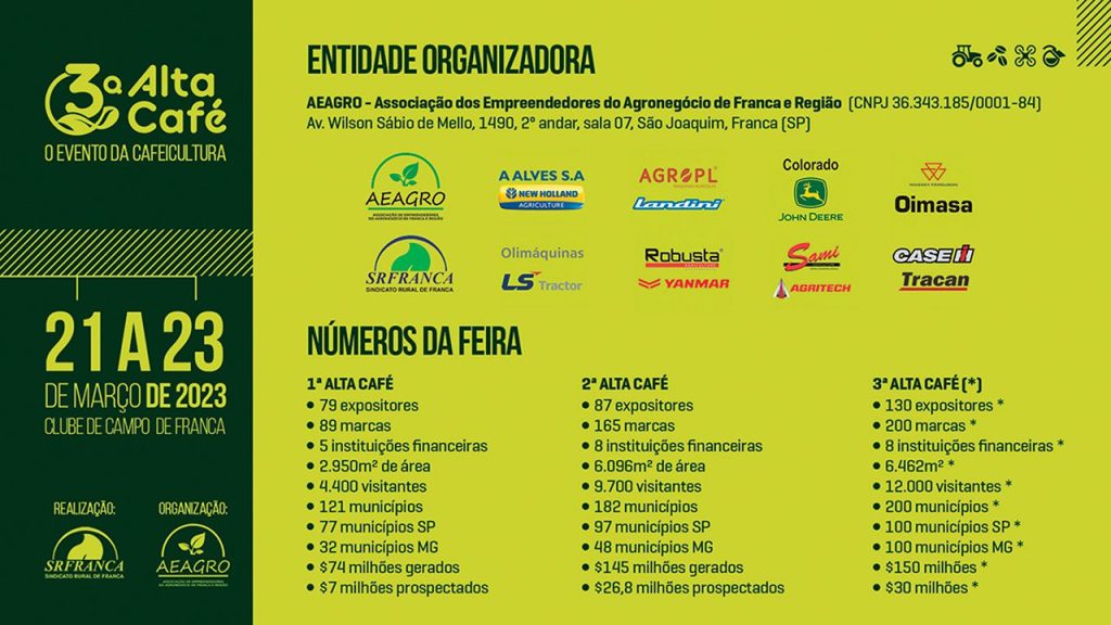 O presidente fez questão de mostrar, em números, a importância da cafeicultura para a Região, além de destacar a importância das empresas responsáveis pela AEAGRO e organizadoras da ALTA CAFÉ: A.Alves (New Holland), AgroPL (Landini), Colorado (John Deere), Oimasa (Massey Ferguson), Olimáquinas (LS Tractor), Robusta Tratores (Yanmar-Solis), Sami Máquinas (Agritech), e Tracan Máquinas (Case iH).