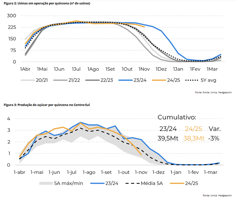 Já o relatório da Unica sinalizou o início da entressafra, com uma queda na moagem de cana e um mix de açúcar e Açúcar Total Recuperável (ATR) abaixo das expectativas do mercado, o que gerou um tom altista para os preços.