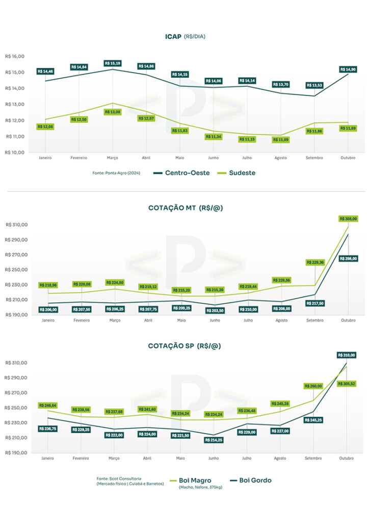 Os custos com alimentação, que representam uma das principais despesas no confinamento, apresentaram sinais de alta trazendo um sinal de alerta aos pecuaristas. O Índice de Custo Alimentar em Confinamento (ICAP) no Centro-Oeste fechou outubro em R$ 14,90, registrando alta de 10% no último mês, enquanto se manteve estável no Sudeste.