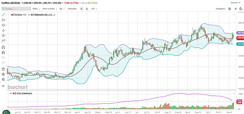 As cotações do café na bolsa de Nova York encerram mais uma semana de muita volatilidade. Com o vencimento das opções contra dezembro/24 nesta sexta-feira (08) muitos fundos ajustaram suas posições e agitaram o mercado, buscando realização de resultados; além disso, a aproximação do início do período de entrega do mesmo vencimento no próximo dia 20 faz com que as rolagens Z4xH5 se intensifiquem.