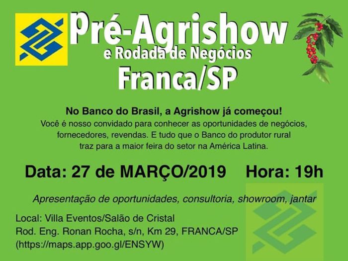 A Superintendência Regional do Banco do Brasil, com o suporte da Agência Estilo e todas as demais agências do Banco do Brasil dos municípios vizinhos, tanto em São Paulo, quanto em Minas Gerais, realizou na noite de 27 de março, no Salão Cristal, do Villa Eventos, em Franca (SP), o evento Pré-Agrishow 2019 e Rodada de Negócios.