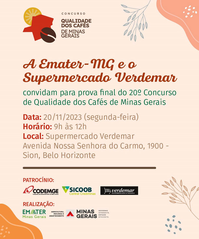 A Empresa de Assistência Técnica e Extensão Rural de Minas Gerais (Emater-MG) e o Supermercado Verdemar promovem na próxima segunda-feira (20/11), em Belo Horizonte (MG), a última etapa de provas do 20º Concurso de Qualidade dos Cafés de Minas Gerais.