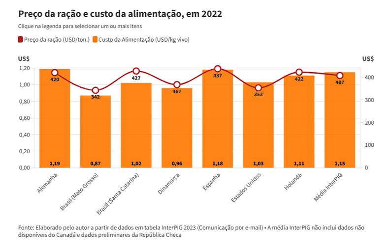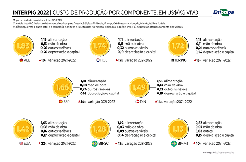 O Brasil mantém a liderança mundial, entre 17 países, no valor do custo de produção em dólares por quilo vivo de suínos. O País participa com os dados dos estados de Mato Grosso e Santa Catarina. Em Mato Grosso, o custo de produção em 2022 ficou em US$ 1,13 por quilo vivo de suíno, enquanto em Santa Catarina ficou em US$ 1,28.