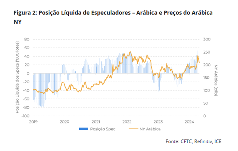 Segundo Natália Gandolphi, analista de Café da Hedgepoint Global Markets, “no momento, as quedas de preços estão mais correlacionadas a movimentos especulativos do que a fatores fundamentais. Por exemplo, em nossa análise mensal, temos observado a vulnerabilidade implícita às posições especulativas em recorde (Figura 1). É importante notar, no entanto, que, de acordo com a correlação entre preços e posição especulativa, havia mais espaço para correção, em direção a 202-209 c/lb, considerando uma regressão linear dos últimos 70 períodos, desde janeiro de 2023 e a série de 5 anos – nível que o primeiro contrato está atualmente testando (Figura 2)”.