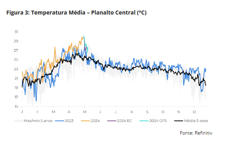 Ao mesmo tempo, as temperaturas ainda não baixaram de seus níveis históricos: de acordo com dados da Refinitiv, a região registrou temperaturas de 29,9 °C nos últimos dias, enquanto a média esperada para o período seria em torno de 25 °C. Nesse sentido, não são apenas os padrões irregulares de chuva que ameaçam a umidade do solo neste momento, e, consequentemente, o desenvolvimento da safra de 24/25.