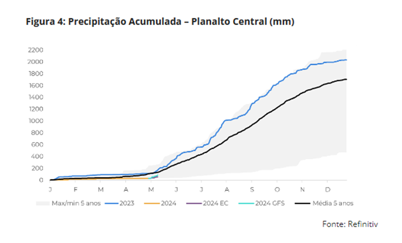 Embora as previsões continuem a sugerir um aumento nos níveis de chuva nas próximas semanas – com previsões de 2 semanas indicando de 90% a 150% dos volumes normais, em comparação com os atuais 0% a 20% – essas previsões ainda não se traduziram efetivamente em uma recuperação. A Figura 4 mostra os níveis cumulativos de precipitação para 2024 na região do Planalto Central, acompanhados pelas previsões EC e GFS.