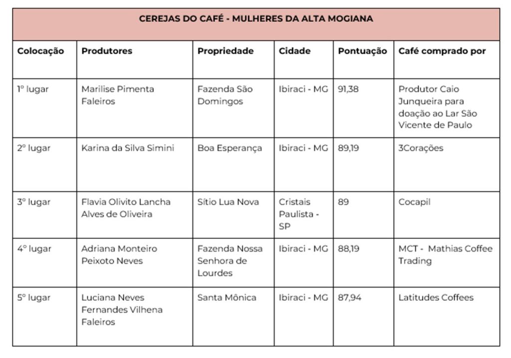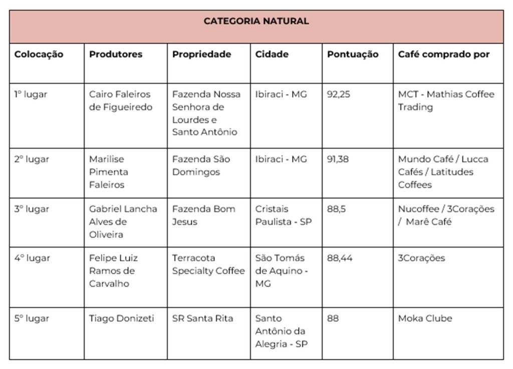 O resultado dos concursos foi emocionante pois revelou pontos extremamente altos para os finalistas com cafés acima de 90 pontos, que são grãos raros e que demonstram o terroir da Região da Alta Mogiana. A grande família campeã foi da produtora Marilise Pimenta Faleiros, da Fazenda São Domingos, no município de Ibiraci (MG) que conquistou o primeiro e segundo lugares na Categoria Natural e o primeiro lugar no Cerejas do Café, junto com seu filho, Cairo:  “Eu fiquei muito surpresa e muito emocionada pelas premiações. Vi nossos esforços serem coroados. Acrescente-se a isso a emoção de ganhar prêmios de alta relevância para quem faz da cultura cafeeira o seu objetivo maior. Intimamente ofereci esse prêmio aos meus antepassados: bisavós, avós, meu pai, Laerte Faleiros, que por toda uma vida labutaram na lavoura de café. E também ao meu irmão, Maury Faleiros, que por duas vezes levou o prêmio de melhor café da Alta Mogiana, e que nos deixou tão precocemente, há 4 anos atrás.  Quero agradecer o carinho de todos os presentes e principalmente o incentivo para seguirmos em frente, buscando sempre mais a excelência de nosso produto”, revelou a produtora Marilise.
