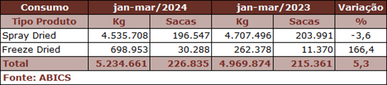 O consumo de café solúvel no Brasil alcançou 5.235 toneladas no primeiro trimestre de 2024, volume que implica crescimento de 5,3% na comparação com as 4.970 toneladas consumidas de janeiro ao fim de março do ano passado. Os dados fazem parte de relatório estatístico da Associação Brasileira da Indústria do setor, a Abics.
