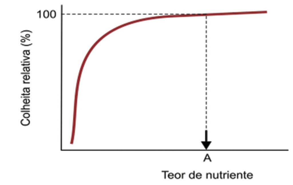 Figura 1. Colheita relativa (CR) de café em função do teor de nutriente no solo. O teor A corresponde a 100% da CR, a partir do qual a produção não responde à adubação com este nutriente. [1]