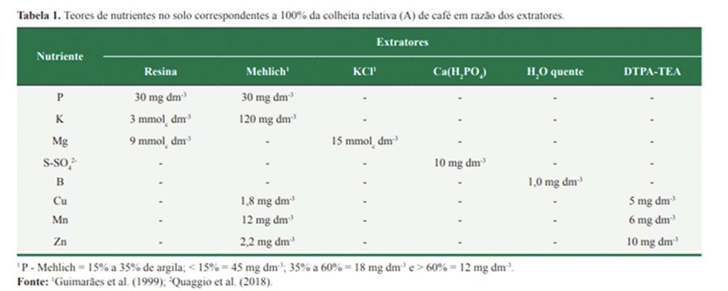 Tabela 1. Teores de nutrientes no solo correspondentes a 100% da colheita relativa (A) de café em razão dos extratores. [1]