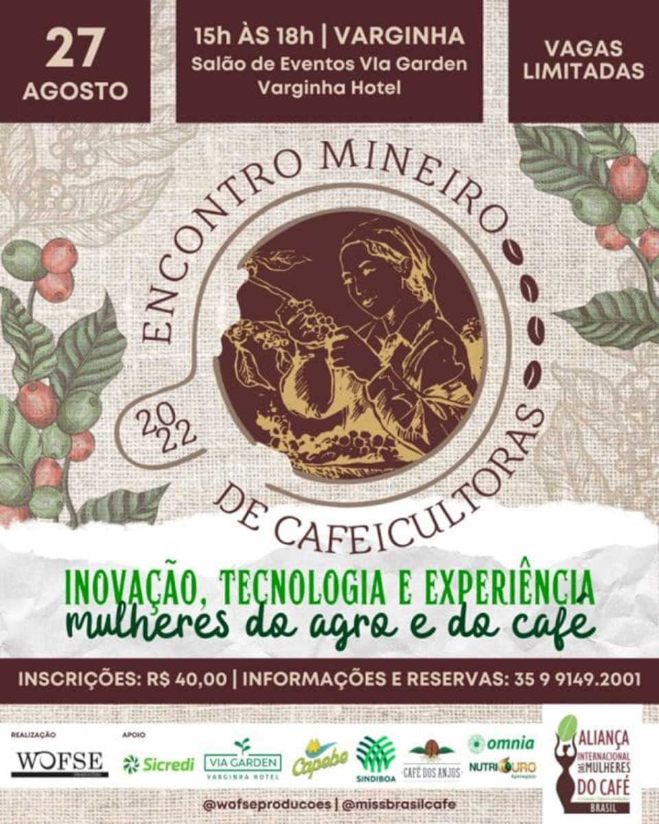 A cidade de Varginha (MG) recebe, no dia 27 de agosto, a 1ª edição do Encontro Mineiro de Cafeicultoras. O evento, realizado pela WOFSE Produções, foi idealizado para fomentar encontros e troca de experiências entre histórias inspiradoras e o fortalecimento da união da mulher no campo, em especial no café.