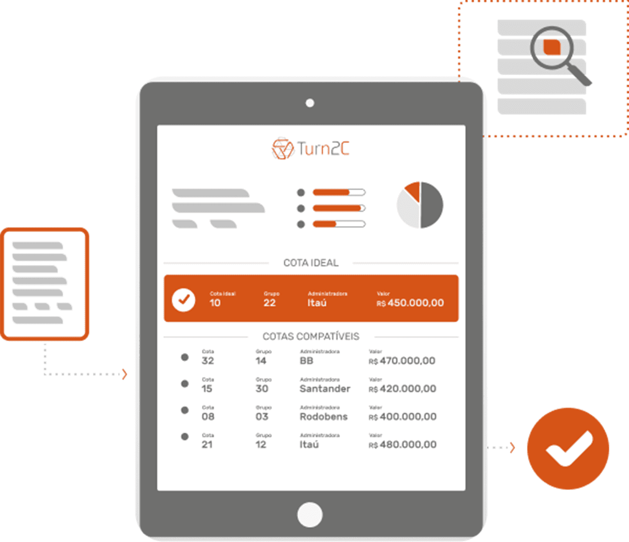 Por meio de inteligência artificial, a Turn2C encontra o plano mais apropriado para o comprador ter acesso mais rápido ao bem e pagando o menor valor. Para isso, a plataforma conecta as empresas parceiras que têm clientes interessados em comprar um bem ou serviço aos produtos das administradoras cadastradas. Atualmente, elas são 15. Isso representa cerca de 65% das cotas ativas das administradoras que vendem seus planos por meio de vendedores externos.