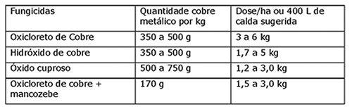 Estima-se que a dose de cobre necessária para o controle da ferrugem seja o equivalente a 800 g de cobre metálico por hectare. A dose recomendada para o controle da mancha aureolada não foi até o momento determinada, mas deve ser próxima ou superior a esta, por se tratar de uma doença bacteriana, de mais difícil controle.
