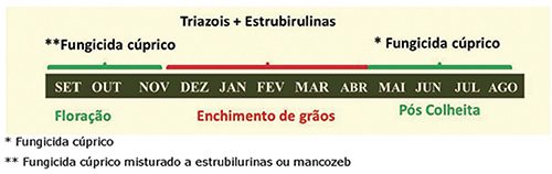 Para o controle da ferrugem são sugeridas 4 a 6 aplicações de fungicidas cúpricos, realizadas em intervalos de 30 dias, que têm início em novembro/dezembro e terminam em abril. Quanto mais alta a carga da lavoura, e mais favoráveis as condições climáticas para a ferrugem, maior o número e menor o intervalo entre as aplicações.
