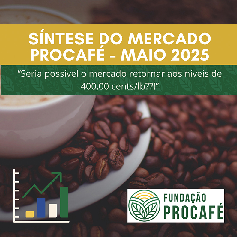 No mês de maio/2025, na ICE Futures US (Bolsa de Nova Iorque), o café Arábica, que iniciou o mês com o fechamento do primeiro dia de negócios em 377,50 cents/lb, chegou a trocar de mãos na máxima de 391,95 cents/lb, para depois encerrar o mês com fechamento em 339,80 cents/lb, portanto, um mês de intensa queda.