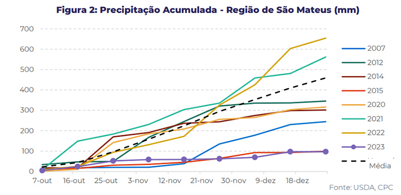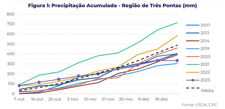 “Esta fase é crucial, pois marca o estágio de enchimento, e dados históricos indicam que a precipitação inadequada durante este período pode afetar significativamente os rendimentos. Um ponto de atenção é evidente na região de Três Pontas em Minas Gerais, onde os níveis acumulados de chuva de outubro até a terceira semana de dezembro estão alarmantemente 30% abaixo da faixa normal. Essa região depende fortemente da precipitação, tornando a situação preocupante”, diz Natália Gandolphi, analista de Café da companhia.