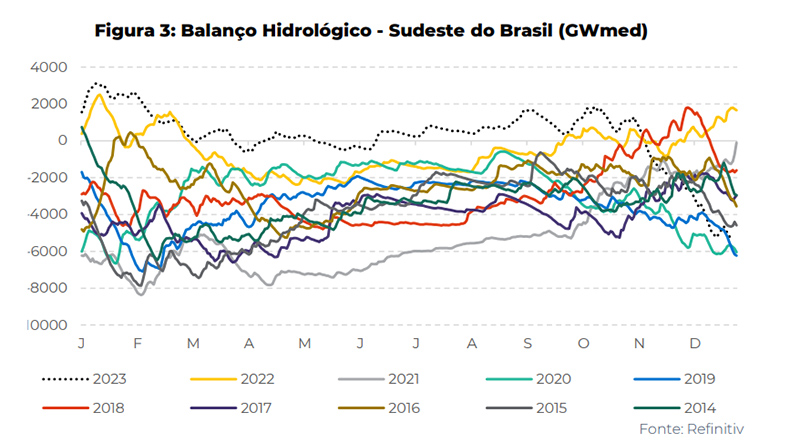 O atual balanço hidrológico no Sudeste reflete as condições de 2020, que precederam a quebra na safra 21/22, resultando em uma redução de 3% na produtividade média em comparação com o ano anterior de bienalidade negativa (19/20).