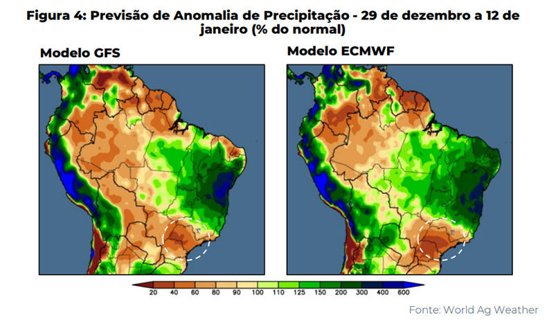 O balanço hidrológico no Sudeste se assemelha ao registrado em 2020, que gerou a quebra de safra do ciclo 21/22. Durante esse período, a produtividade média do café caiu 3% em comparação com o ano anterior de bienalidade negativa (19/20), resultado de condições climáticas desfavoráveis. Agravando as preocupações, os modelos de previsão indicam uma contínua redução no balanço hidrológico até a primeira semana de janeiro.