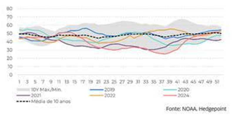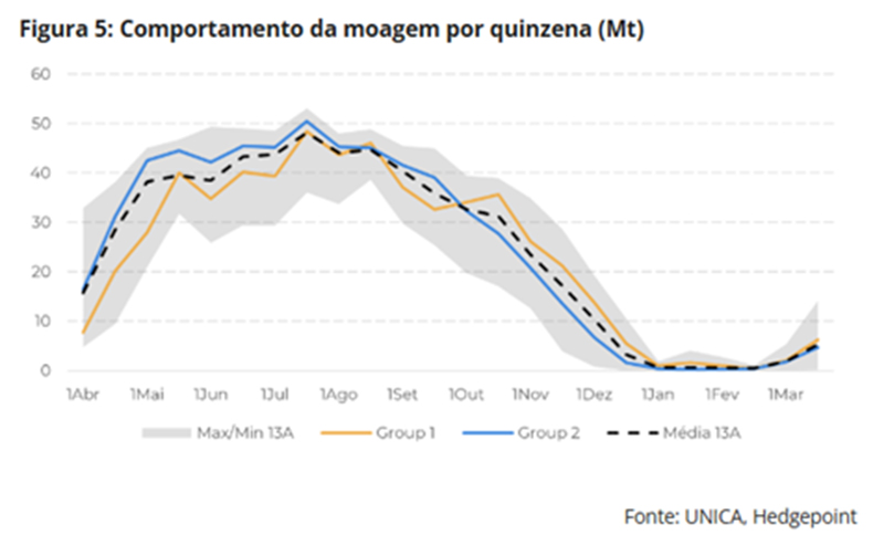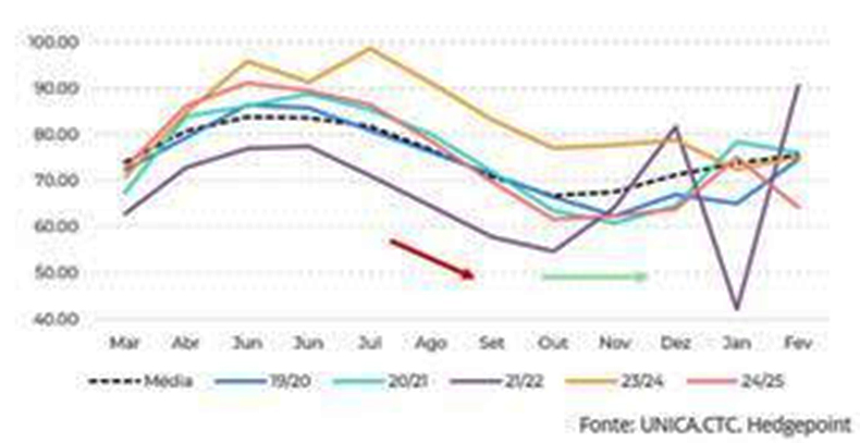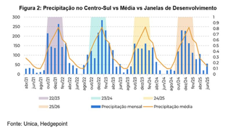No final de 2024, analistas de mercado, incluindo a Hedgepoint, previam que a nova safra superaria a anterior, ou seria tão boa quanto, especialmente devido às chuvas favoráveis entre outubro e janeiro, um período crítico para o desenvolvimento da cana na região Centro-Sul do Brasil. “No entanto, agora parece que os efeitos prolongados dos incêndios do ano passado e o início seco de 2025 afetaram negativamente a cana moída durante a primeira parte da safra”, diz.
