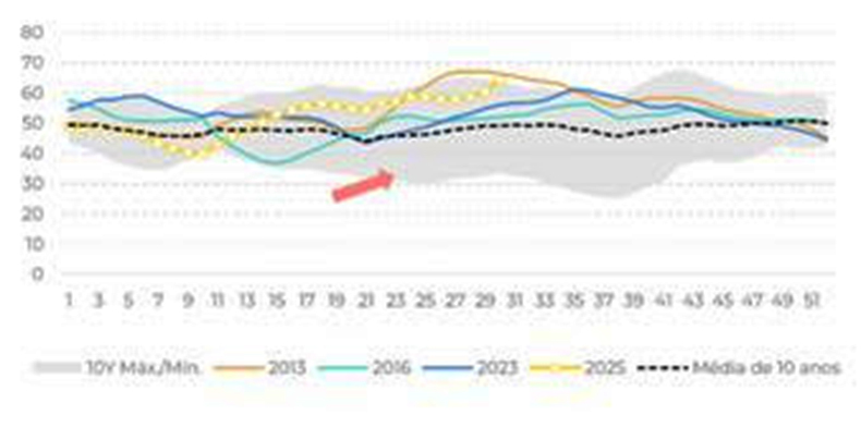 Em termos de volume de moagem, essas três safras também tiveram mais cana processada após o final de julho. “Por exemplo, enquanto a média de 13 anos mostra que cerca de 50% da cana da safra é moída até o final da segunda quinzena de julho, a média para o Grupo 1 foi de apenas 46%. Em contrapartida, as safras recentes que não apresentaram recuperação do VHI no meio da safra nem resiliência do TCH (24/25, 23/24, 21/22, 20/21 e 19/20 – Grupo 2) tiveram uma média de 53% moída no mesmo período. Como a safra 25/26 parece se alinhar mais com o primeiro grupo, é provável que haja alguma melhora. Com base em nossos cálculos, o TCH acumulado ainda pode chegar a 76 t/ha, resultando em aproximadamente 605 Mt de cana”, explica.