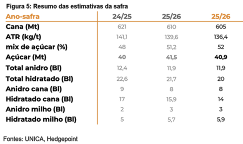 “A ambiguidade decorre principalmente do fato de que o ATR permanece abaixo das safras anteriores, enquanto o mix de açúcar continua a bater recordes, apesar das discussões anteriores sobre um possível desvio para o etanol”, diz.