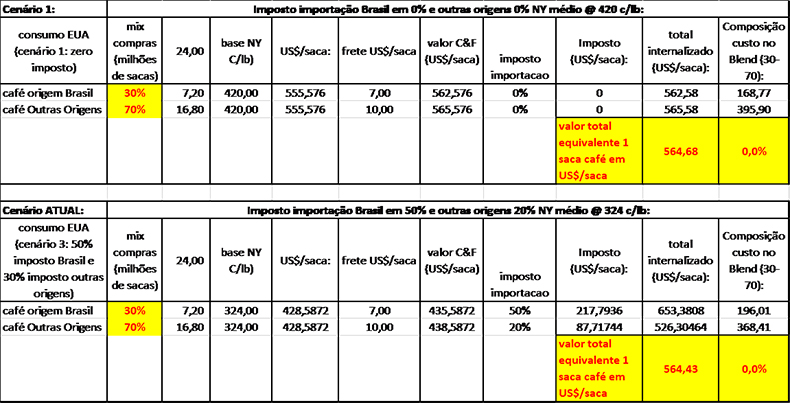 Então, agora, com as tarifas em 50% para o Brasil e 20% na média para “outras origens”, NY tem um novo “break-even” ao redor dos 324 centavos de dólar por libra-peso para que o seu custo da matéria prima fique equivalente quando o mercado negociou nos 420 centavos de dólar por libra-peso: