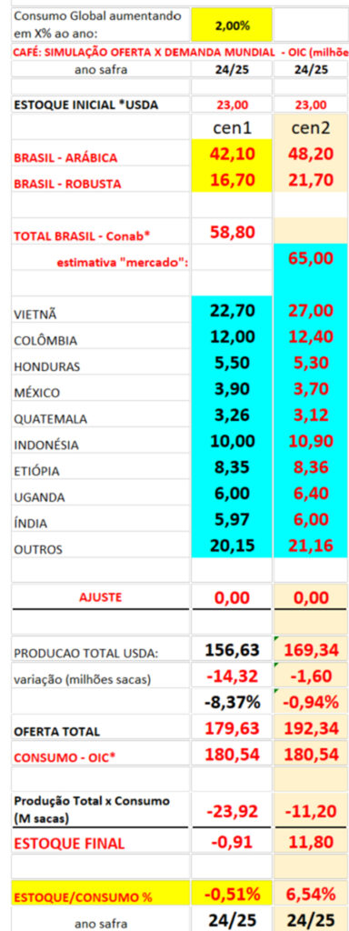 Considerando o aumento da demanda da OIC* para o ano safra 24/25 em 180,40 milhões de sacas e considerando um aumento anual no consumo em 3% ao ano ao invés de 2% ao ano, no ano safra 29/30 o mundo estará consumindo acima de 210 milhões de sacas de café! Para que a produção mundial consiga suprir essa demanda, então o mundo precisa motivar o produtor a expandir “hoje” e não daqui há 3-4 anos! Senão, como já dito em outro comentário “vai faltar café”! Ou, o café vai virar uma bebida de luxo!