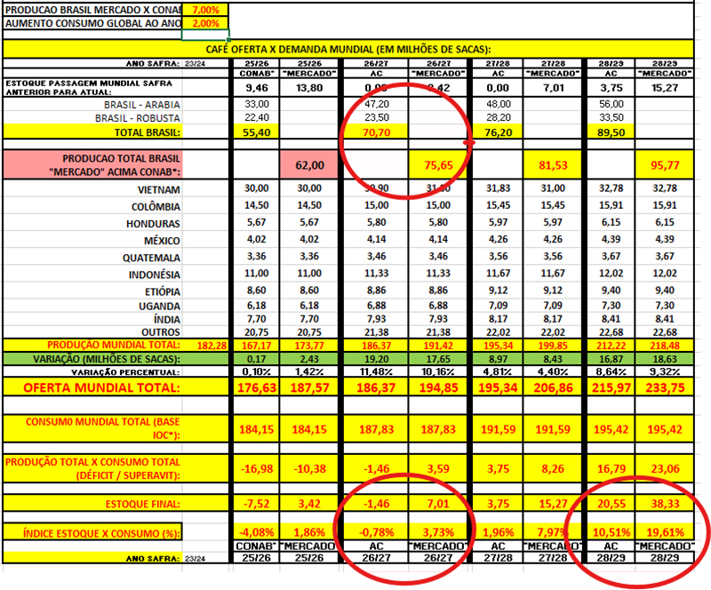 As estimativas para a próxima safra brasileira 26/27 já começaram (StoneX = 70,70 milhões de sacas) e outras estimativas estão prestes a pipocar no mercado. Como mencionado em comentários anteriores o mercado mundial do café continuará justo / apertado pelos próximos 3 anos!