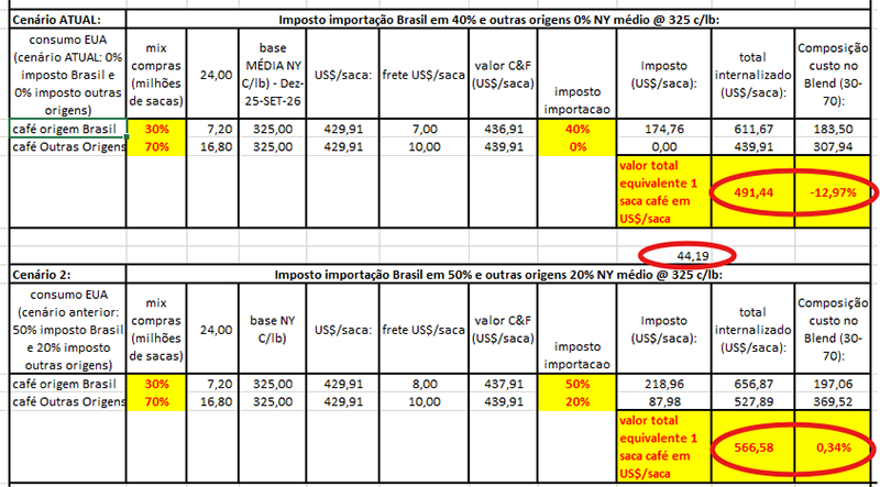 Considerando o imposto de importação para origem Brasil ainda nos 40% então, por outro lado, o importador americano continuará tendo um custo adicional para o café brasileiro ainda em aproximadamente 170 US$/saca (para o café tipo arábica). E esse “spread de origem” continuará dando oportunidade para as tradings operarem o envio do café brasileiro para outras origens e o café destas origens para os Estados Unidos livre de tarifas!
