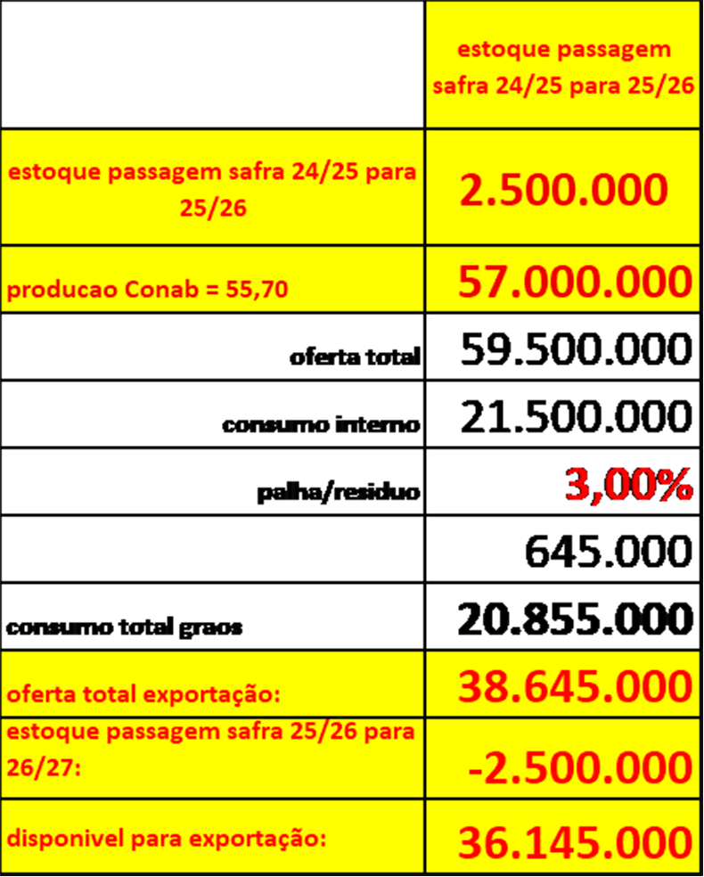 Considerando então (e sendo “otimista”) uma produção total em 57 milhões de sacas, um estoque de passagem da safra 24/25 para a safra 25/26 em 2,50 milhões de sacas (muitos acreditam que esse estoque de passagem foi inferior a 1 milhão de sacas), um consumo interno em 21,50 milhões de sacas, e um estoque de passagem da safra 25/26 para a próxima 26/27 novamente em 2,50 milhões de sacas então o Brasil terá disponível para exportar durante o período julho-25/junho-26 APENAS 36,15 milhões de sacas.