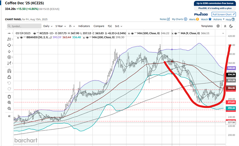 O vencimento set-25 em NY encerrou a semana @ 341,65 centavos de dólar por libra-peso! Nos últimos 10 pregões o contrato subiu +5.745 pontos (76 US$/saca = 410 R$/saca)!