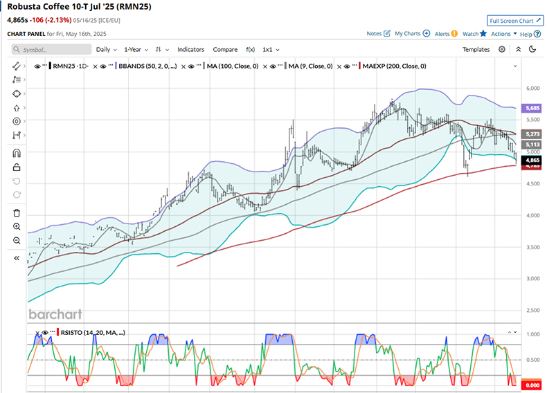 O café arábica encerrou a semana com o vencimento julho-25 caindo em NY -6,38% (fechamento anterior / máxima / mínima / fechamento atual respectivamente @ 387,75 / 390,10 / 362,75 / 365,65 centavos de dólar por libra-peso) e o café robusta vencimento julho-25 caindo em Londres -7% (fechamento anterior / máxima / mínima / fechamento atual respectivamente @ 5.226 / 5.241 / 4.809 / 4.865 US$/tonelada)!
