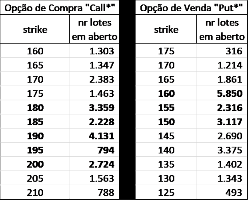 As posições das opções de compra “call*” e as opções de venda “put*” dos “contratos em aberto” encerraram assim: