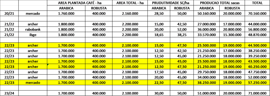 Já para a safra 23/24, mantendo a mesma área plantada e considerando a recuperação total das lavouras, e ajustando novamente a produtividade para uma produção média em 30,00 sacas/ha para o café arábica e uma produção média em 50,00 sacas/ha para o café robusta, o Brasil já poderá voltar ter uma produção acima das 70 milhões de sacas.