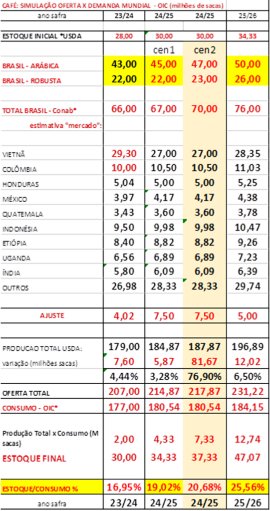 Conforme o quadro da “oferta x demanda” apresentado aqui no comentário anterior, se tudo correr bem na safra brasileira 24/25 e 25/26 a produção será suficiente para novamente voltar a aumentar o estoque regulador mundial do café (independente de onde esse estoque vai estar armazenado). Os fundos + algoritmos acompanham esses números com muita atenção, e qualquer mudança na percepção deles poderá mudar a tendência do mercado. MUITO CUIDADO e ATENÇÃO daqui pra frente.