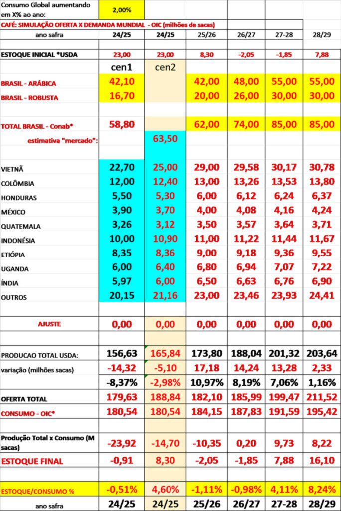 Incrível que muitos analistas e bancos não divulgam os dados do quadro de “oferta x demanda” mundial demonstrando o cenário explosivo para os próximos 2-3 anos. Abaixo volto a compartilhar a minha visão / projeção para os próximos anos ajustando a safra brasileira em função da seca: