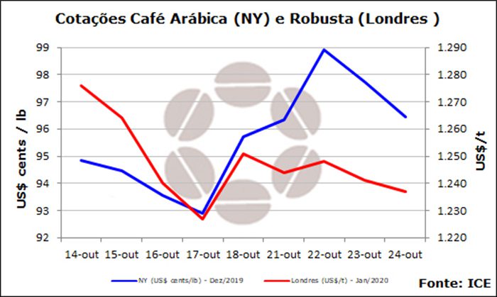 Os contratos futuros do café, em uma semana sem novidades nos fundamentos, movimentaram-se embasados em fatores técnicos e permaneceram praticamente estáveis. Na Bolsa de Nova York, o vencimento dez/2019 do contrato “C” subiu 75 pontos, fechando ontem a US$ 0,9645 por libra-peso. Na ICE Europe, o contrato jan/2020 do robusta encerrou a US$ 1.237 por tonelada, com queda de US$ 14.