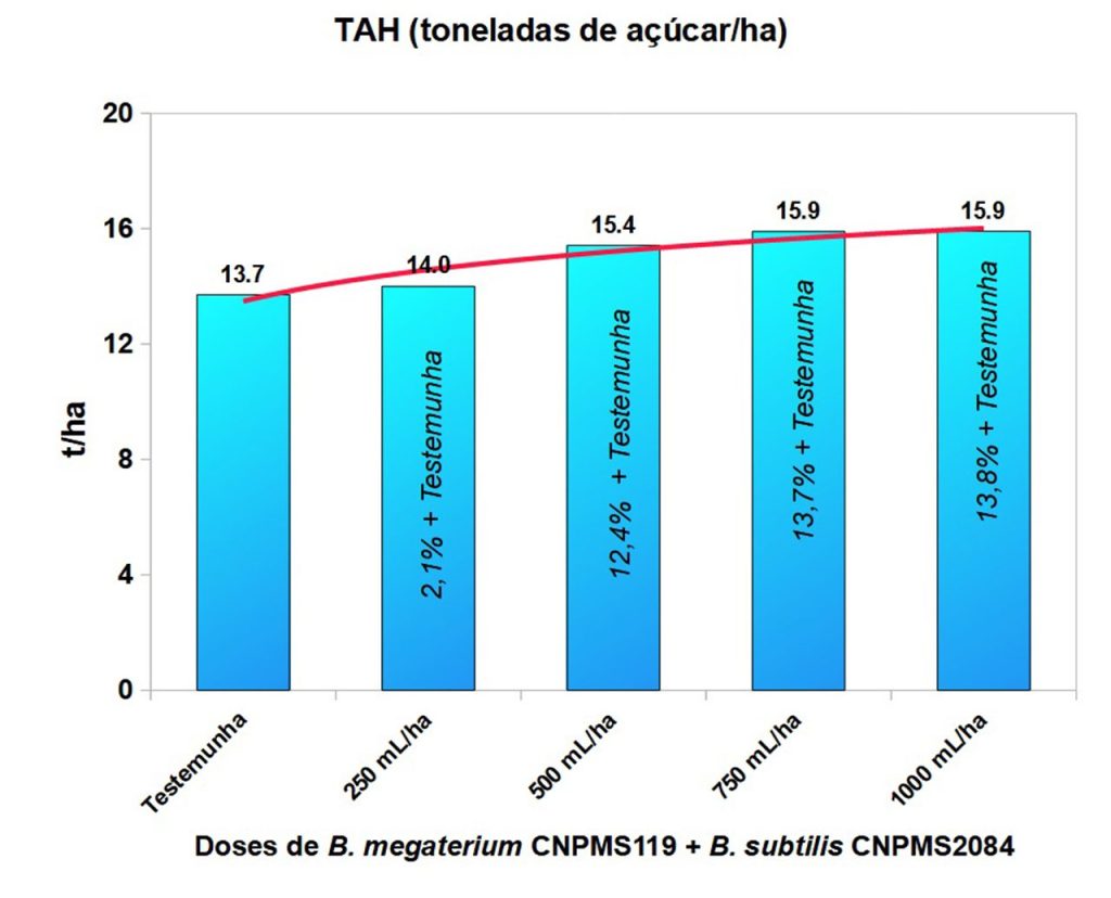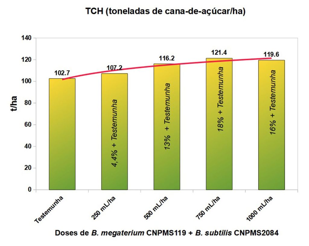 Nas condições experimentais, o uso combinado de doses superiores a 500 ml por hectare do inoculante e aplicando somente 50% da quantidade de adubação fosfatada recomendada foi capaz de promover aumento significativo para os parâmetros de TCH e TAH. “Esses índices são associados, respectivamente, à produtividade e à qualidade da matéria-prima na cultura da cana-de-açúcar, indicando a eficácia do inoculante para essa cultura,” relataram os pesquisadores.