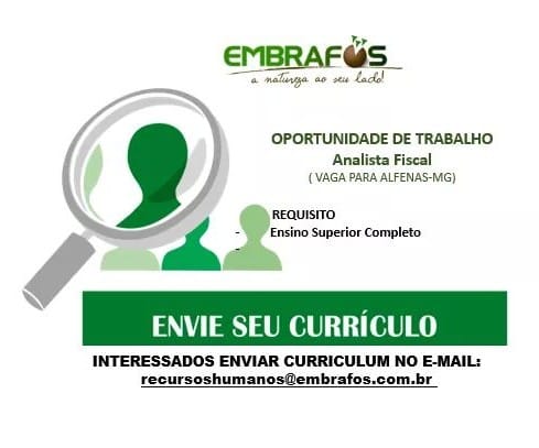 Trabalho no AgroOPORTUNIDADE – Analista Fiscal – Embrafós by Mario22/07/201906746 Compartilhar00OPORTUNIDADE DE TRABALHOVaga para Analista Fiscal para a unidade de Alfenas (MG) da Embrafós.