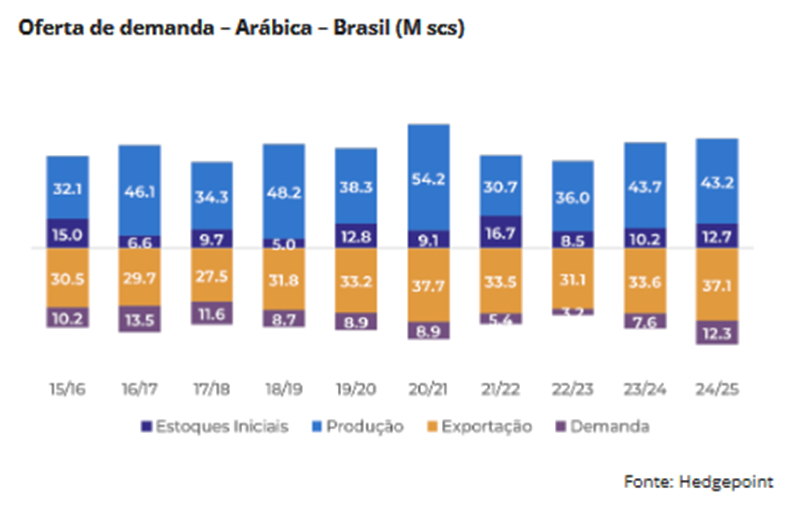 “Um ponto importante é que a redução da safra brasileira reforça o cenário de um déficit global em 24/25, apesar de dados recentes sugerirem que a demanda global em destinos como a Europa e o Japão está mostrando sinais de enfraquecimento, devido aos altos preços atuais. Considerando que uma queda de 0,8% na demanda em 24/25 ainda levaria a um déficit próximo de 4 milhões de sacas, isso poderia se traduzir em apoio aos preços no médio prazo, embora devamos monitorar de perto o possível impacto dos preços na demanda global nos próximos meses”, conclui.