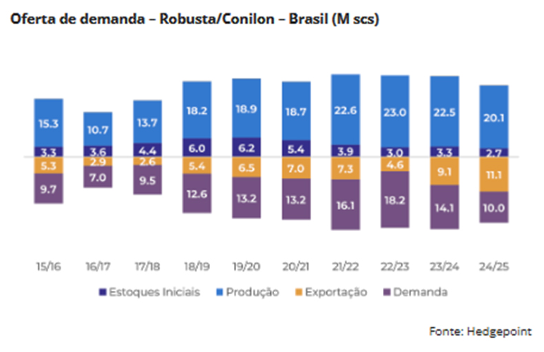 “A queda do rendimento no processamento também nos levou a rever nossas previsões para baixo: nossas estimativas para 24/25 são de uma produção de 63,3 M de sacas, abaixo de nosso número anterior de 66 M de sacas e 4,4% menor que 23/24. A produção de arábica deve finalizar 1,1% inferior que 23/24, com 43,2 M de sacas, em comparação com 44,7 M estimados anteriormente para esta temporada. Quanto ao robusta, nossa expetativa é de uma produção de 20,1 M de sacas (contra 21 M de sacas estimadas anteriormente), uma queda de 10,6% em relação a 23/24”, afirma a analista.