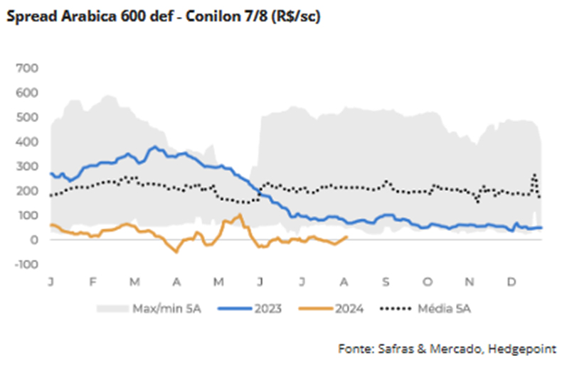 “É importante salientar que esperamos algumas alterações na demanda em 24/25. A demanda doméstica por arábica pode atingir seu nível mais alto desde 16/17, impulsionada pelo aumento do uso da variedade no mix doméstico. Desde o final de 2023, os preços do robusta aumentaram fortemente e o diferencial entre as duas variedades diminuiu, especialmente para as qualidades inferiores utilizadas no mix nacional. O diferencial entre o arábica 600 defeitos e o robusta/conilon 7/8 chegou a atingir valores negativos, o que significa que este último estava sendo negociado a preços mais elevados do que o arábica, incentivando a mudança de mix nos últimos meses”, explica.