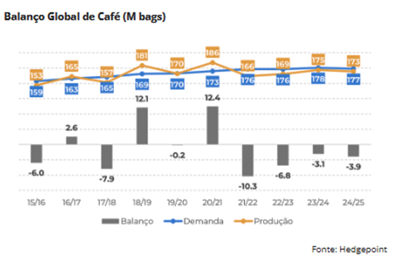 Em termos de exportações, esperamos ver um aumento no arábica e, especialmente, no conilon, dada a maior demanda por grãos brasileiros e a menor oferta no Sudeste Asiático. Por outro lado, em termos de balanço global, podemos estar caminhando para um quarto ano de déficit. Embora a demanda possa ser afetada em 24/25 devido aos altos preços atuais, espera-se que a oferta permaneça limitada devido a menores rendimentos no Brasil e no Vietnã.