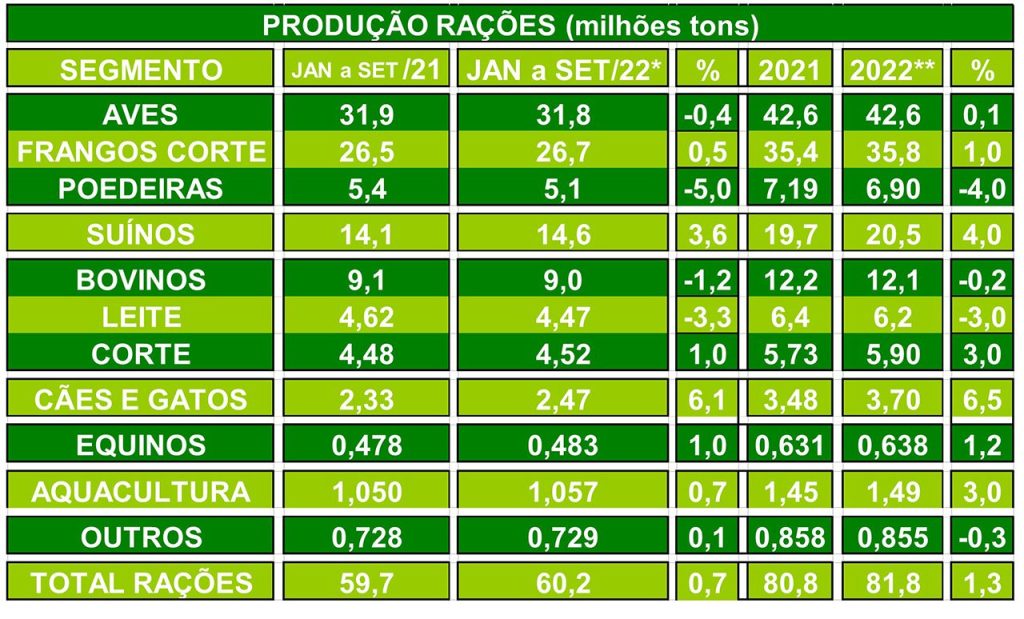 A demanda de rações para frangos de corte de janeiro a setembro alcançou 26,7 milhões de toneladas e avançou 0,5% em resposta ao maior ritmo de alojamento de pintainhos. A previsão é produzir 35,8 milhões de toneladas ao longo de 2022 e ainda avançar 1%.