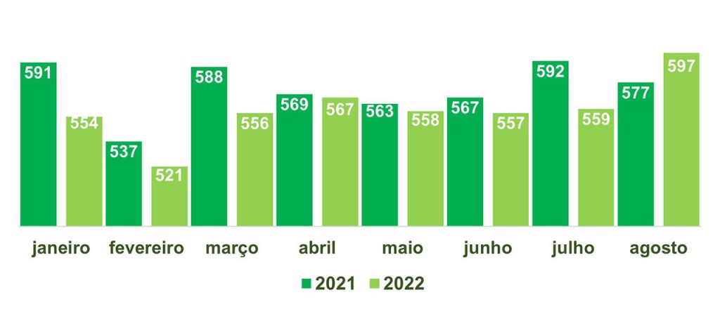 A produção de rações para poedeiras de janeiro a setembro somou quase 5,1 milhões de toneladas, um recuo de 5%, quando comparado ao mesmo período do ano passado. Apesar de alguma reação no alojamento das poedeiras em meados do ano, a demanda não deve superar os 6,9 milhões de toneladas, e assim, retroceder 4% ao longo de 2022.