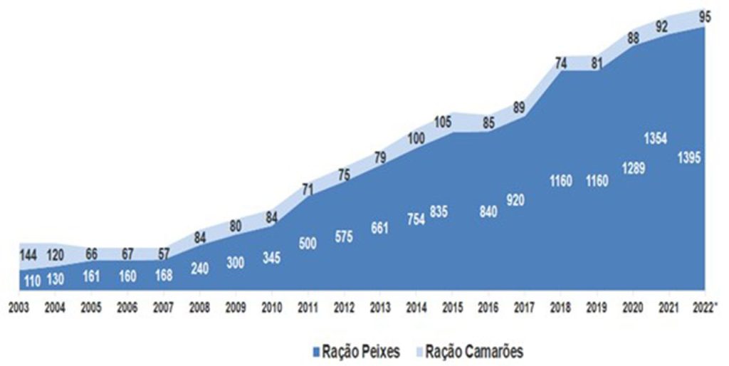A produção de rações para peixes e camarões somou pouco mais de 1 milhão de toneladas de janeiro a setembro, quantidade modulada pela queda no consumo pelos peixes por conta do atípico e persistente clima mais frio nas regiões produtoras, muito embora, moderada recuperação deve se dar nos últimos meses do ano e permitir a produção de aproximadamente 1,4 milhão de toneladas de rações, ou seja, avanço da ordem de 3% em todo o ano de 2022.