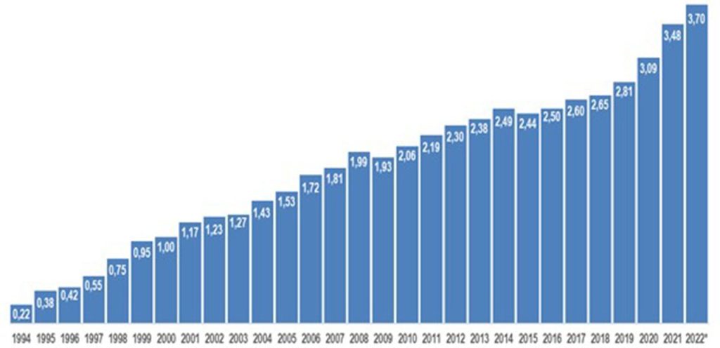 Imagem 3 – Produção de Pintos de Corte (milhões cabeças). (Fonte: Avisite, elaborado Sindirações)